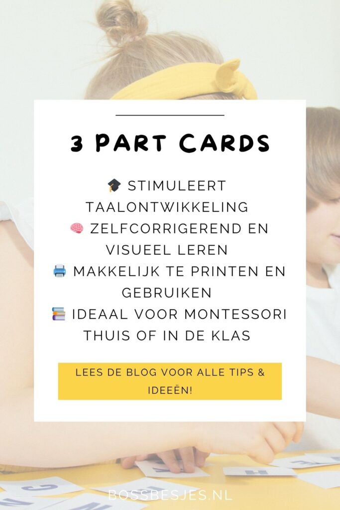 Montessori 3-delige kaarten, ofwel 3-part cards, zijn een visueel en taalkundig hulpmiddel bestaande uit drie onderdelen per begrip: