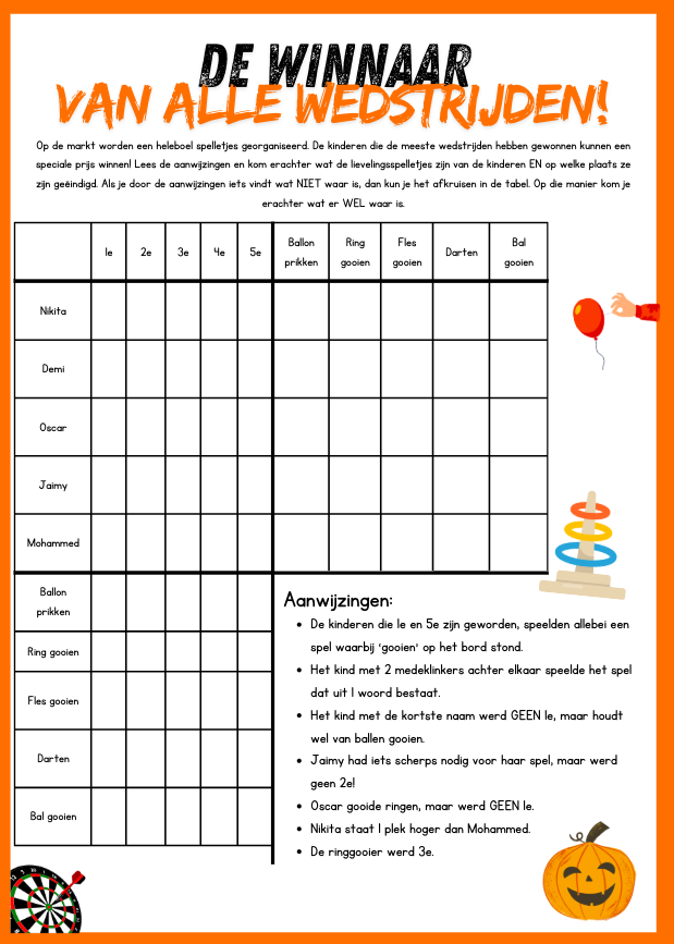 Dit jaar wordt de herfstmarkt bij jou in de buurt georganiseerd. Aan jou de taak om mee te werken aan de voorbereidingen. Dan ben je daarna nog niet klaar natuurlijk, want zodra de markt opengaat begint het eigenlijk pas echt. Durf jij de uitdaging aan te gaan? Aan de hand van leuke, educatieve puzzels, werken de kinderen mee aan de herfstmarkt.