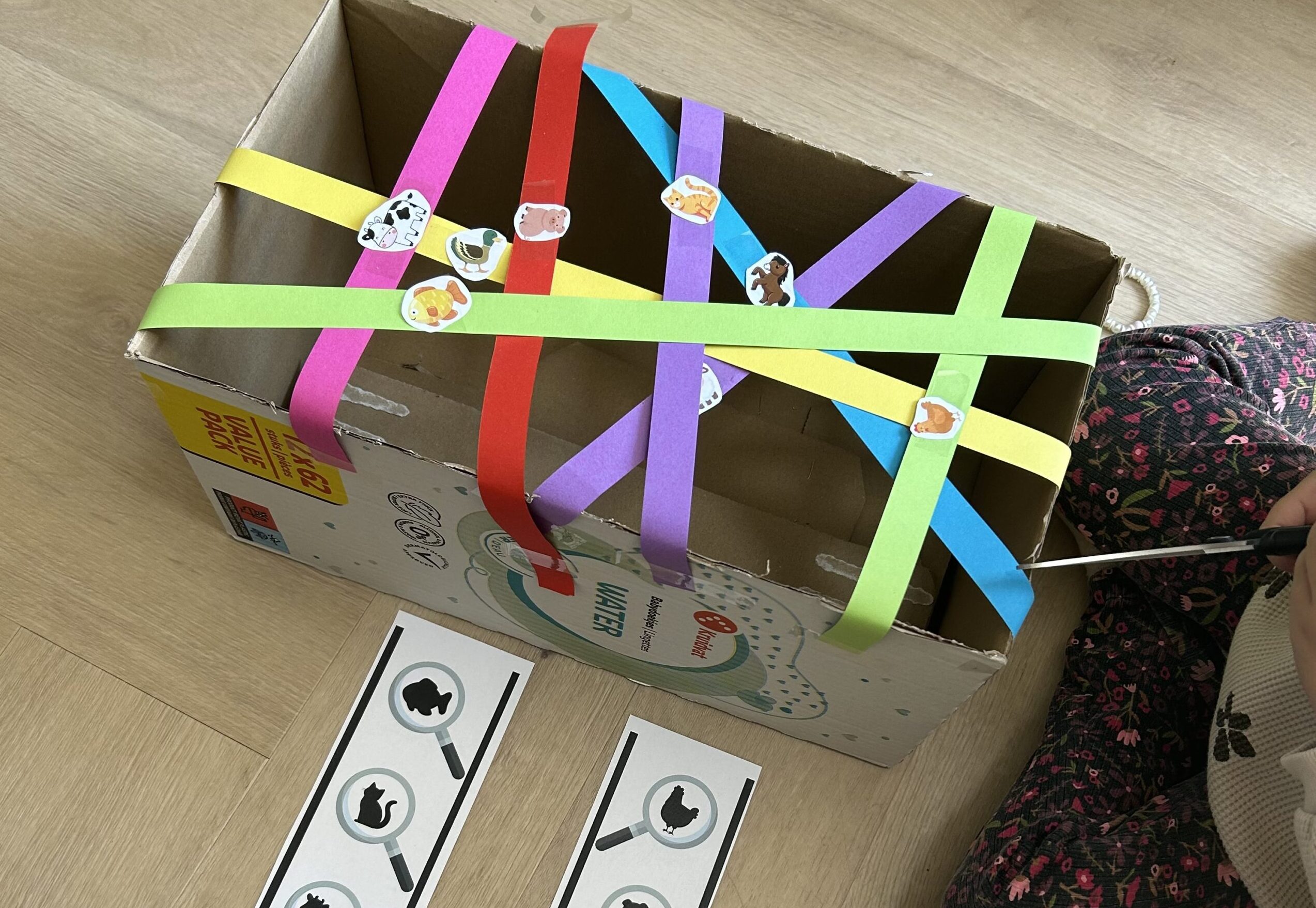 2. Knip alle dierenplaatjes + ‘glazen potjes’ + afkruislijstjes uit en lamineer, zodat je het vaker kunt gebruiken. (Tip: print de ‘glazen potjes’ op dikker papier OF voeg een wit papiertje toe tussen het potje en het dier. Anders hoef je namelijk geen moeite meer te doen om te zien welk dier er verstopt zit).
